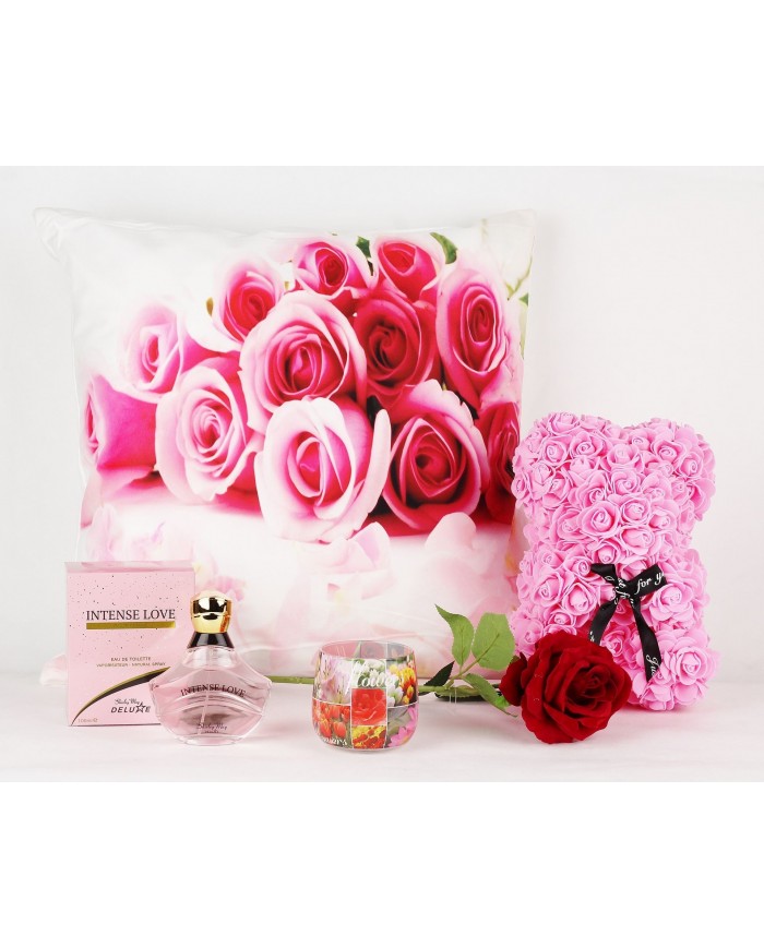 Sada obsahuje medvedík z ruží, parfum, ruže, Valentínsky vankúš, vonná sviečka, štýlové rúška, víno*