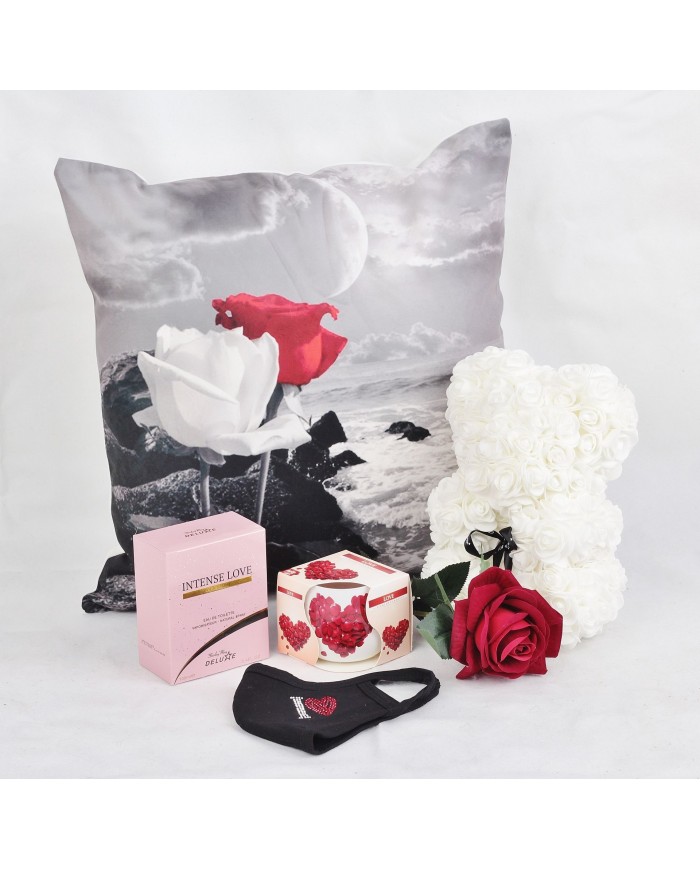 Sada obsahuje medvedík z ruží, parfum, ruže, Valentínsky vankúš, vonná sviečka, štýlové rúška, víno*