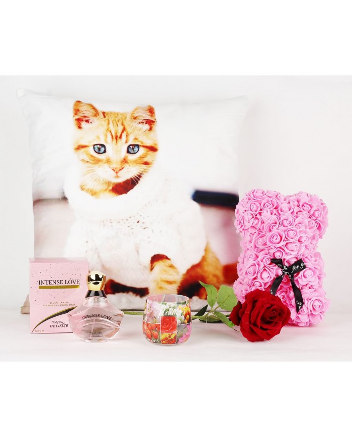 Sada obsahuje medvedík z ruží, parfum, ruže, Valentínsky vankúš, vonná sviečka, štýlové rúška, víno*