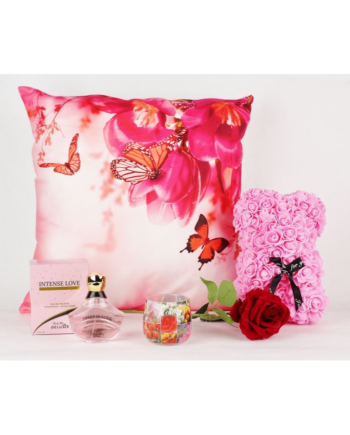 Sada obsahuje medvedík z ruží, parfum, ruže, Valentínsky vankúš, vonná sviečka, štýlové rúška, víno*