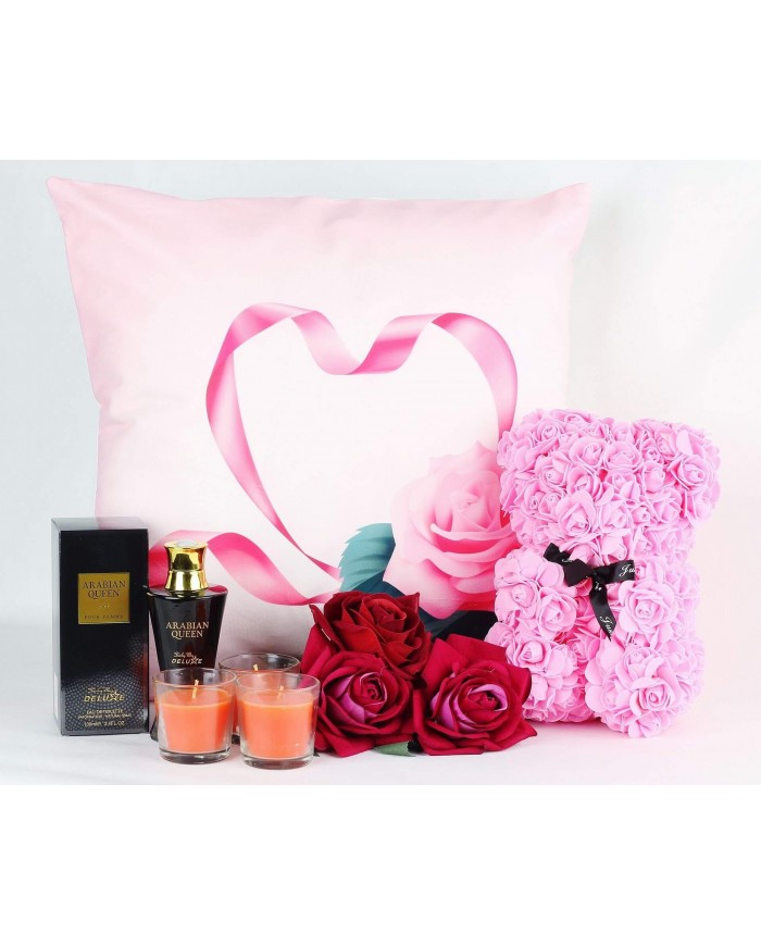 Sada obsahuje medvedíka z ruží, parfum, 3 kvety umelej ruže, vankúš, 3 vonné sviečky, víno*